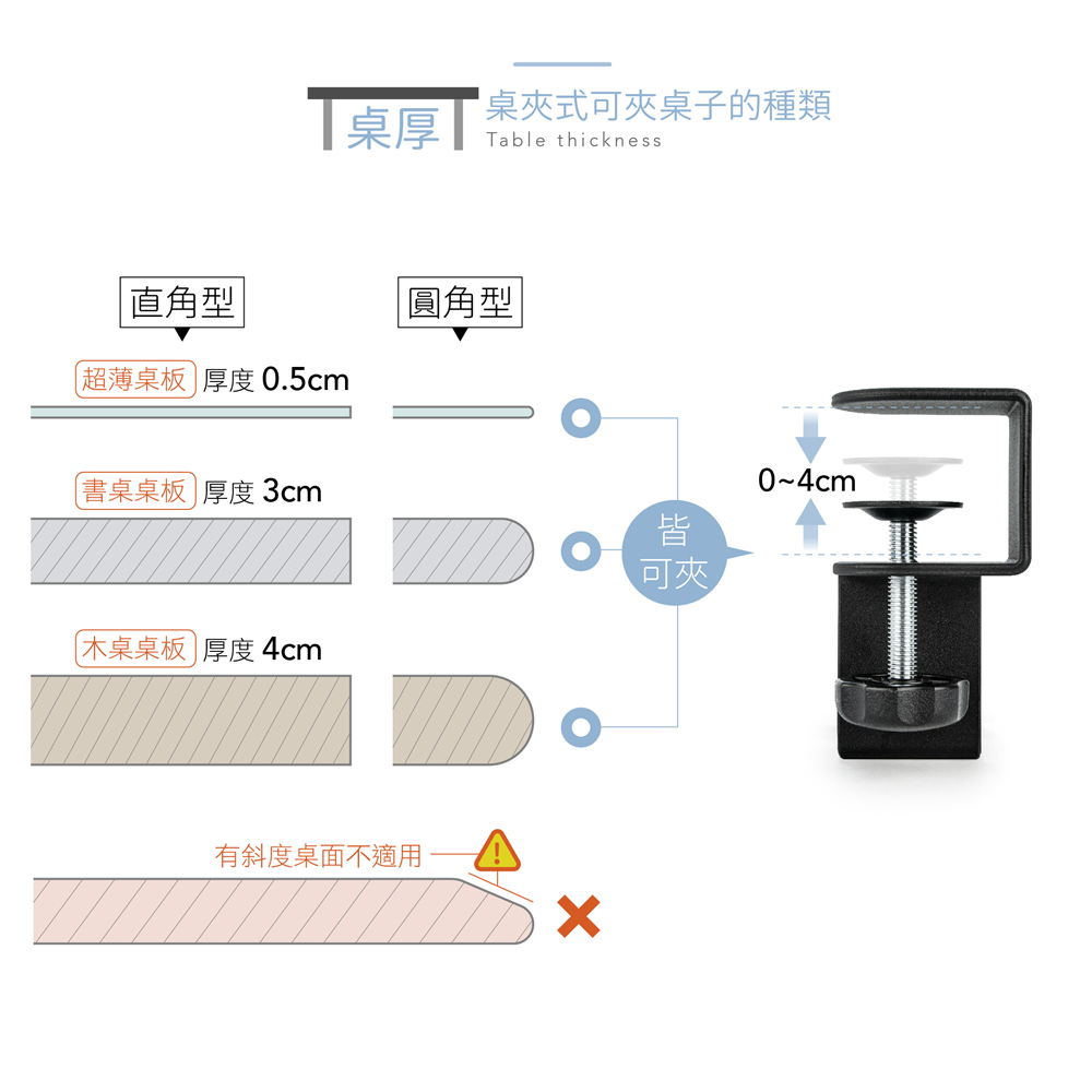 1. 請實際測量桌板厚度,確認厚度在桌夾最大夾距範圍內再行購買