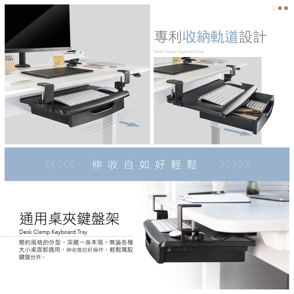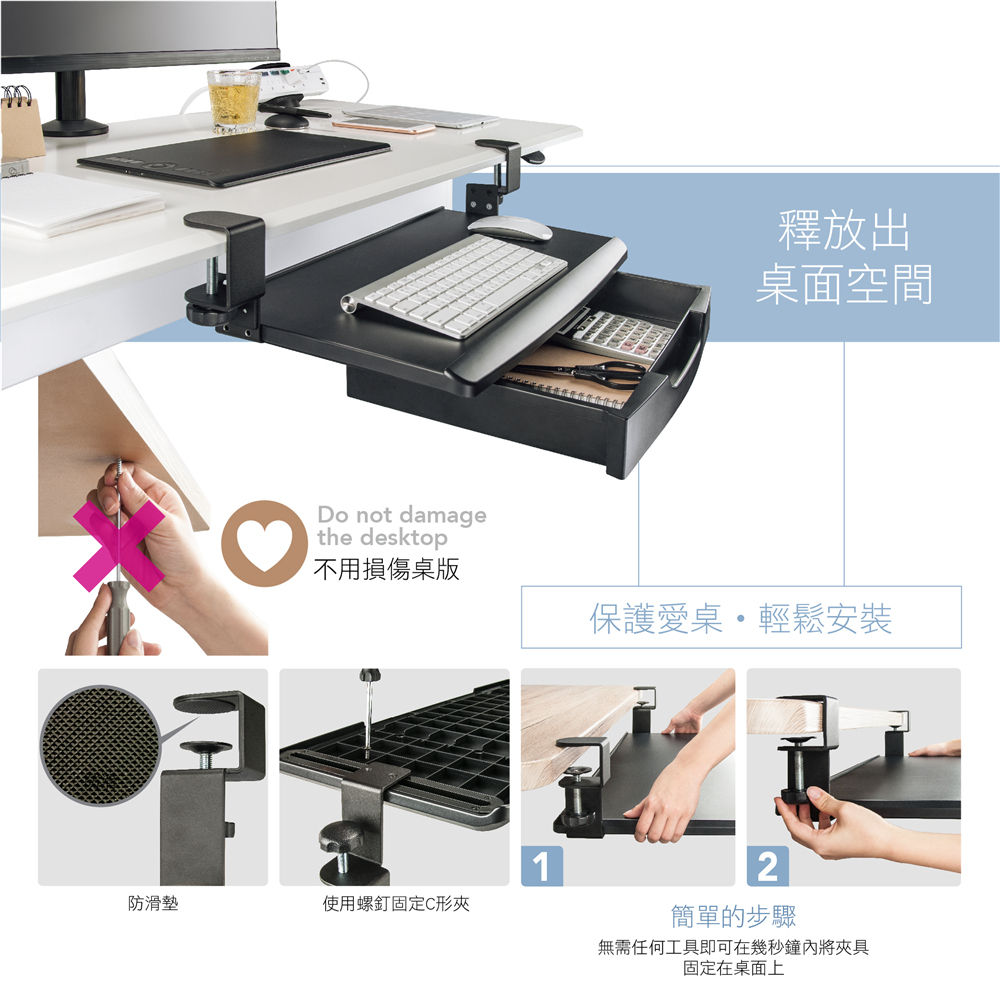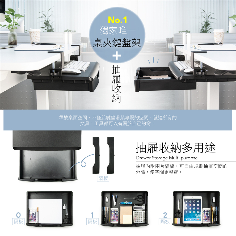 左側桌夾、右側桌夾、配件包、鍵盤平台、抽屜、抽屜隔板