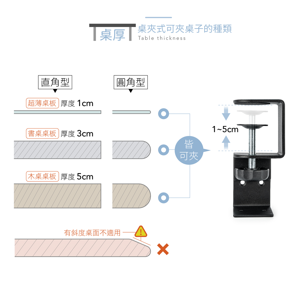 1. 請實際測量桌板厚度,確認厚度在桌夾最大夾距範圍內再行購買