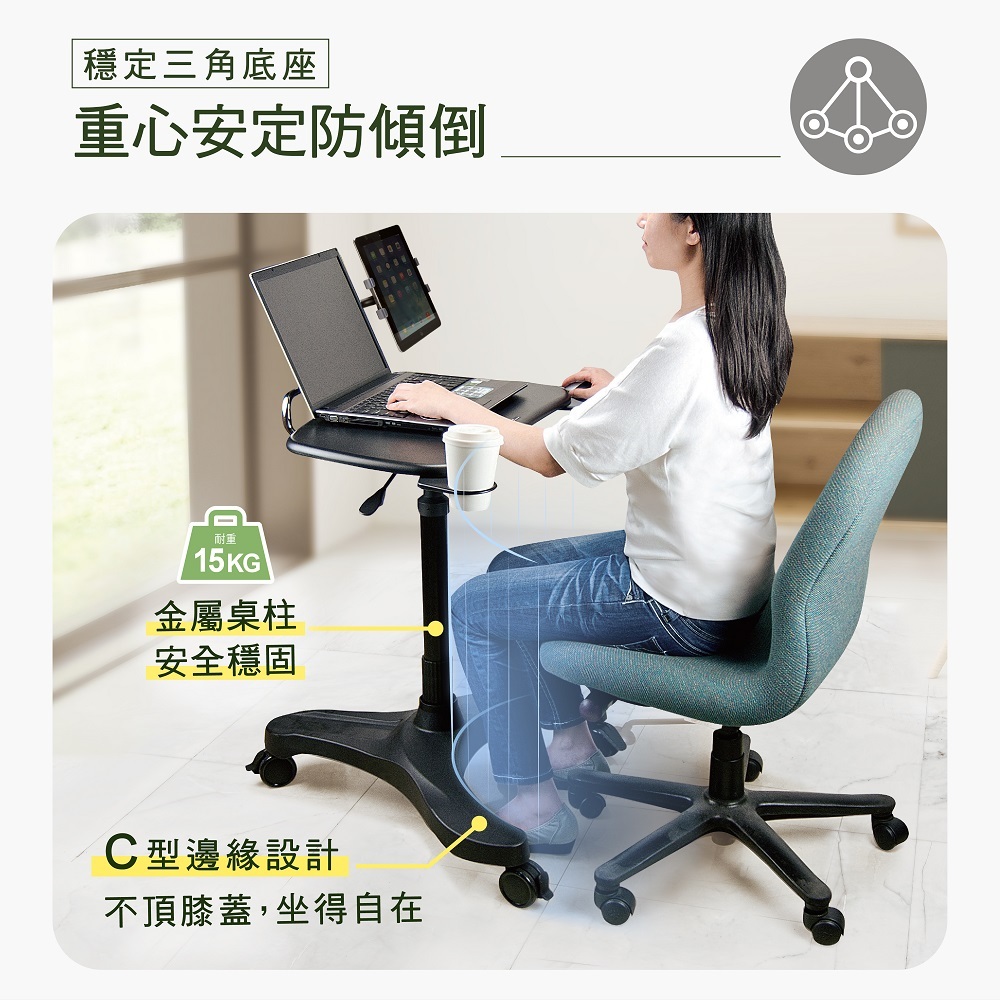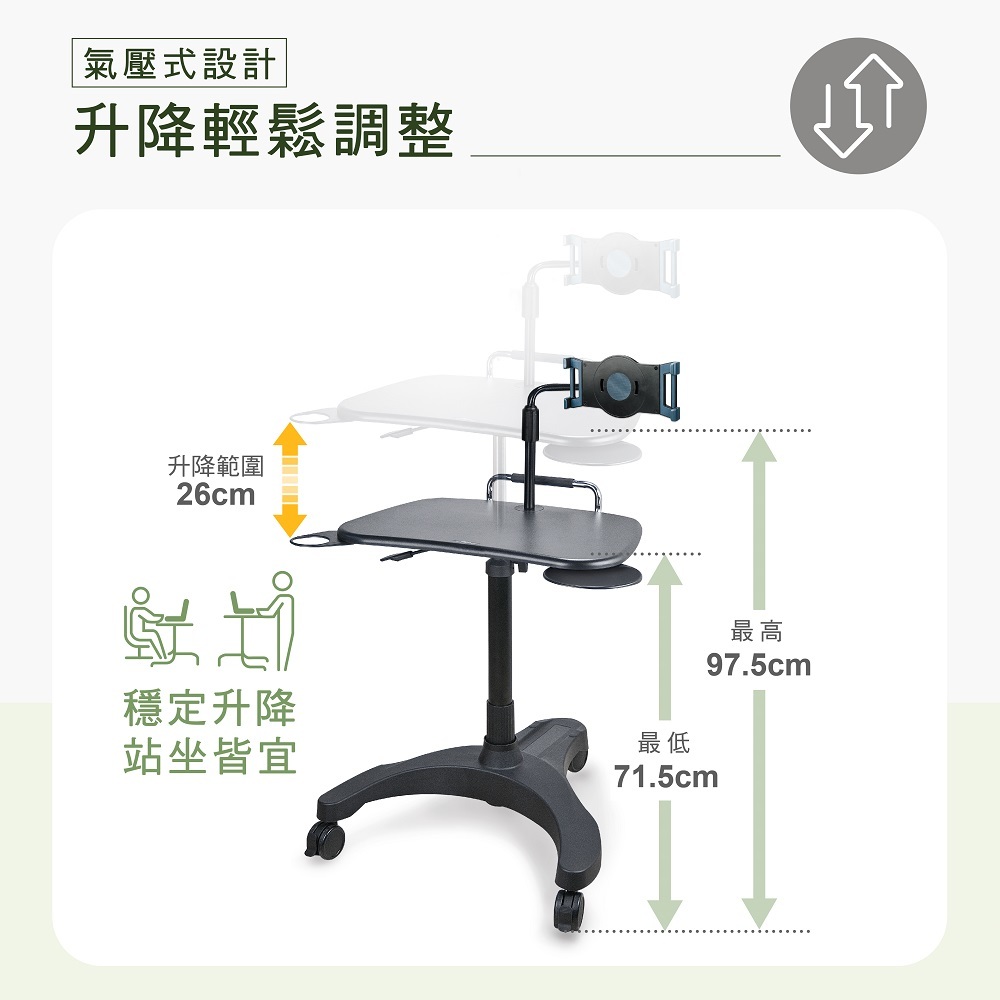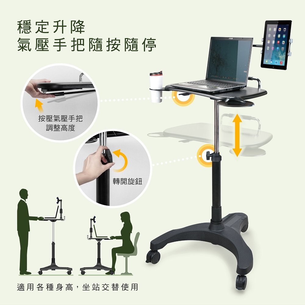 ◆ 整組氣壓式設計,方便高底調整,排除僅坐椅式操作電腦;亦可調站立式操控電腦