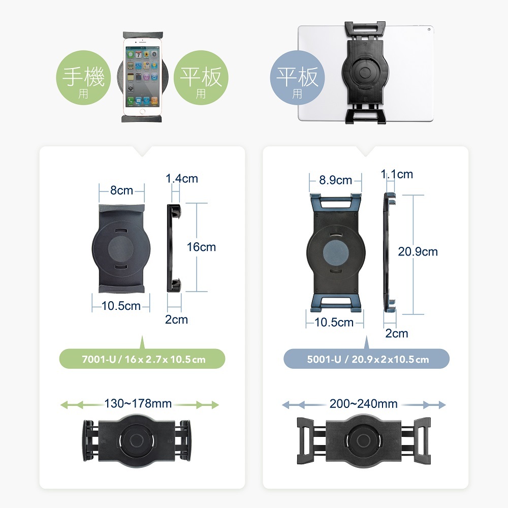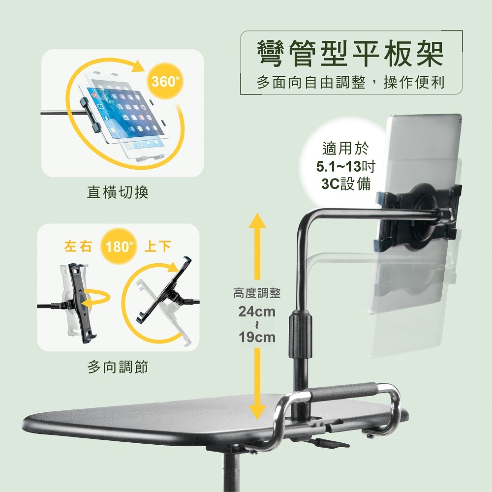 ◆ 平板支架供大部份5'1~13吋3C設備適用,安全堅固,裝卸簡單
