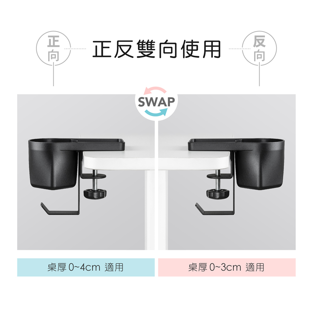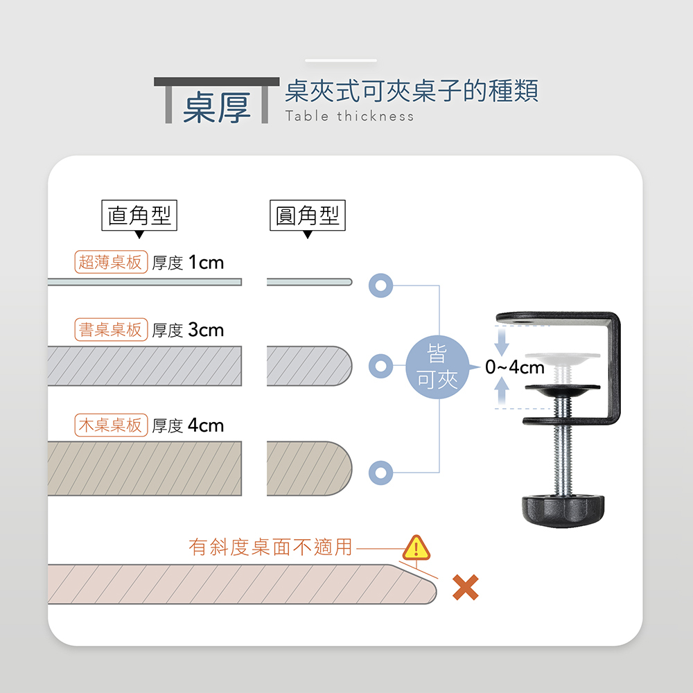 1. 請實際測量桌板厚度,確認厚度在夾距範圍(正面安裝:0-4cm、反面安裝:0-3cm)內再行購買