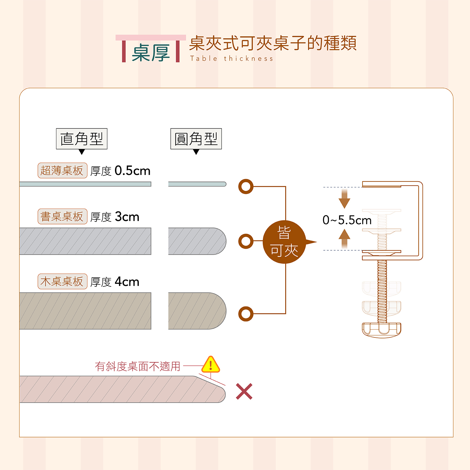 1. 請實際測量桌板厚度,確認厚度在夾距範圍(5.5cm)內再行購買
