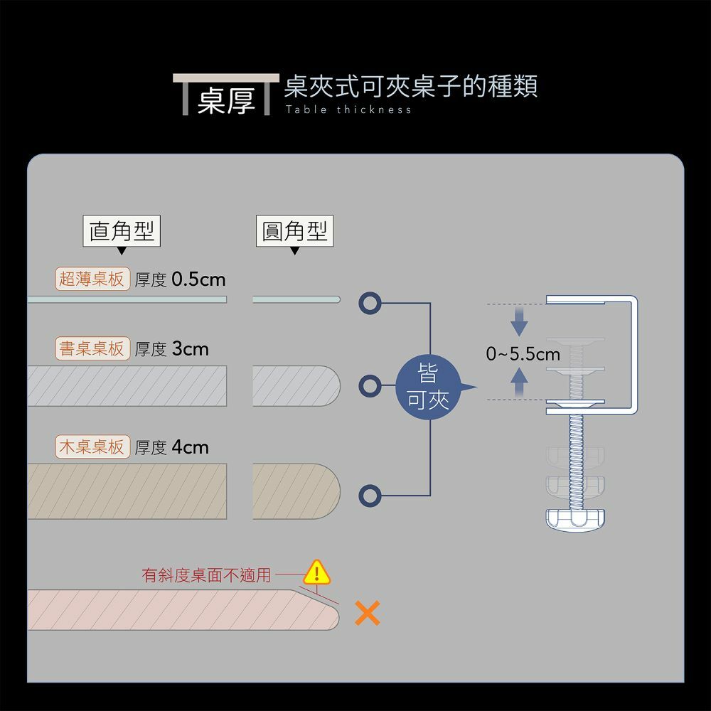 1. 請實際測量桌板厚度,確認厚度在夾距範圍(5.5cm)內再行購買