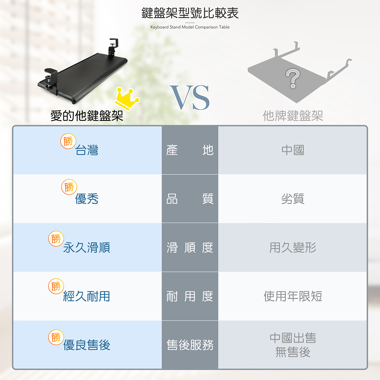 AIDATA 愛得他 KB-5011 可調高度鍵盤架 擁有多段式高度調節功能,可根據個人需求輕鬆調整操作高度,完全符合人體工學設計,搭配穩固的 C 型桌夾設計,輕鬆固定於桌緣,DIY 組裝簡單快速。附帶收納抽屜,讓桌面更加整潔,是兼具舒適與實用的理想選擇。