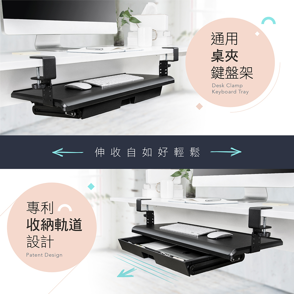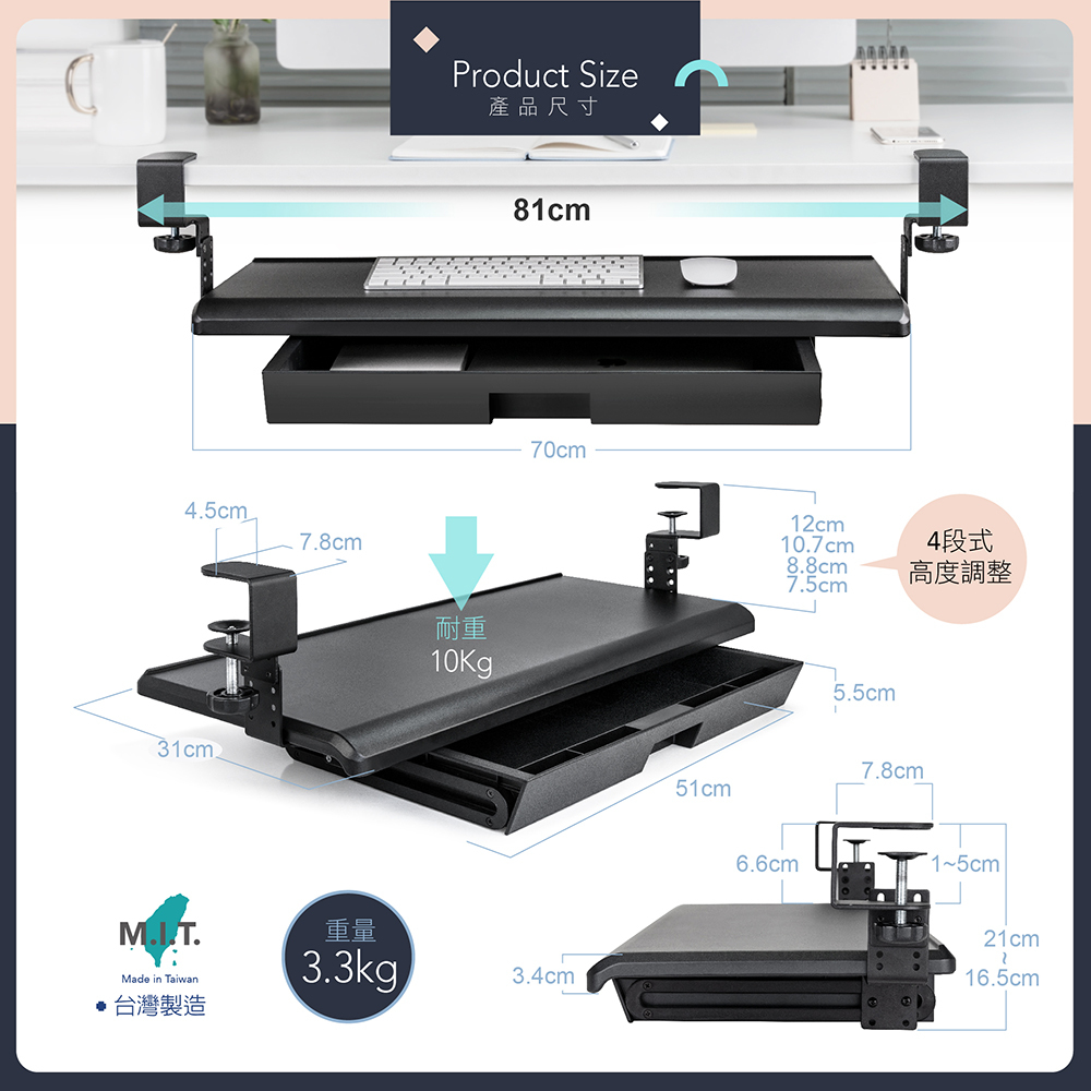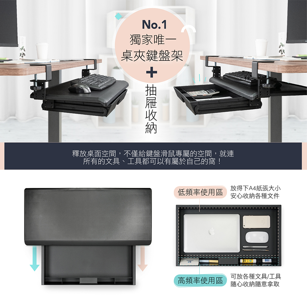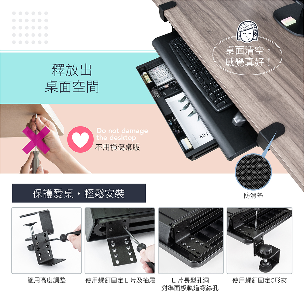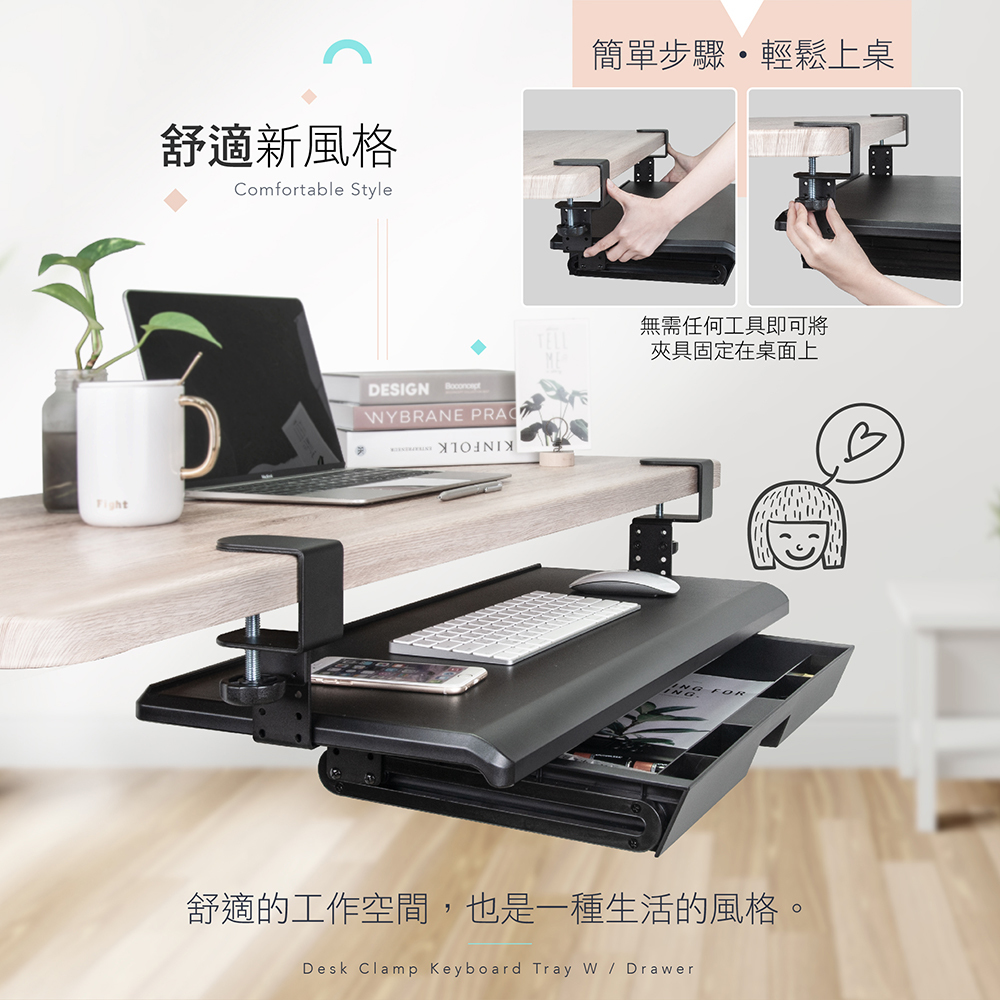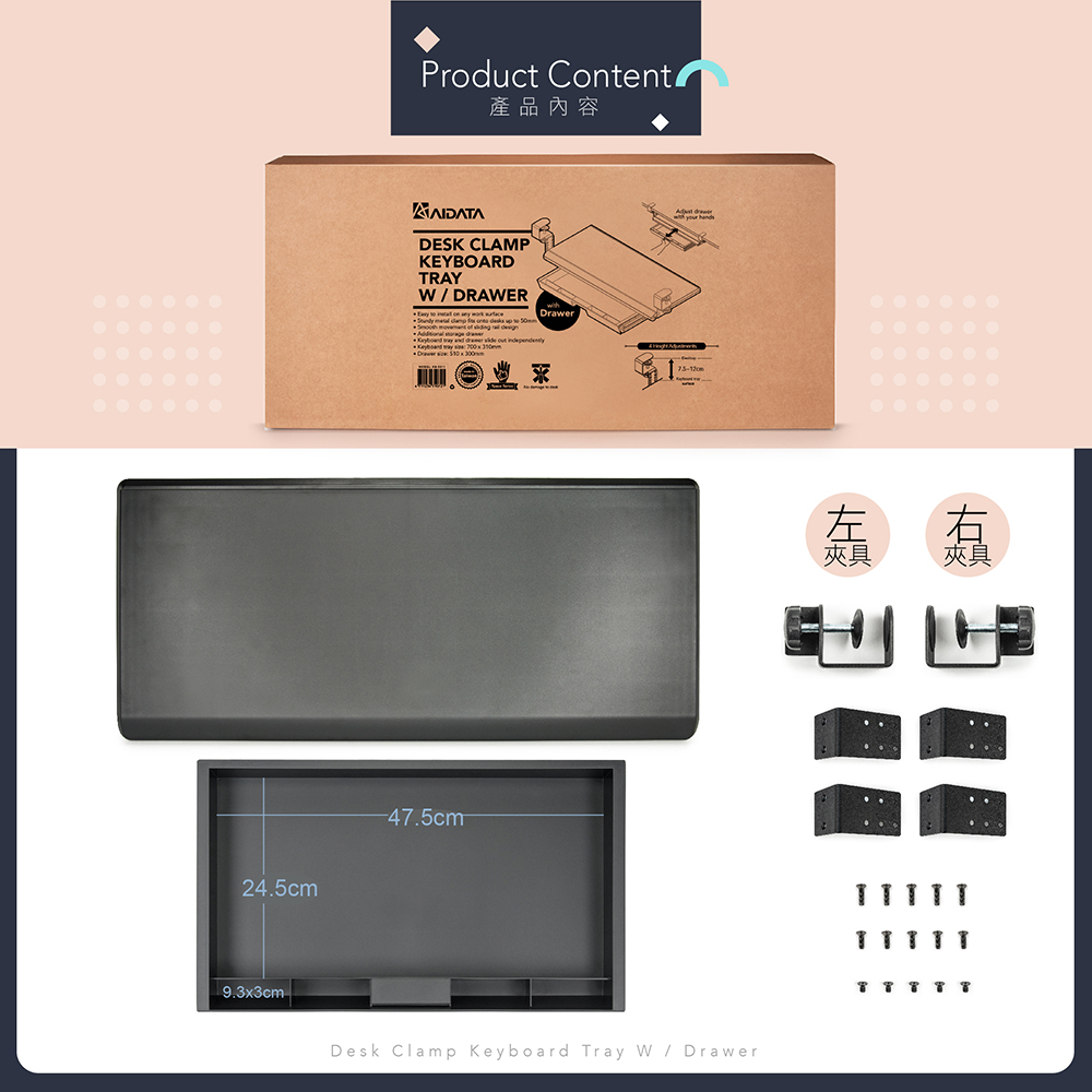 左側桌夾、右側桌夾、L型鐵片x4、螺絲配件包、鍵盤平台、抽屜產品規格: