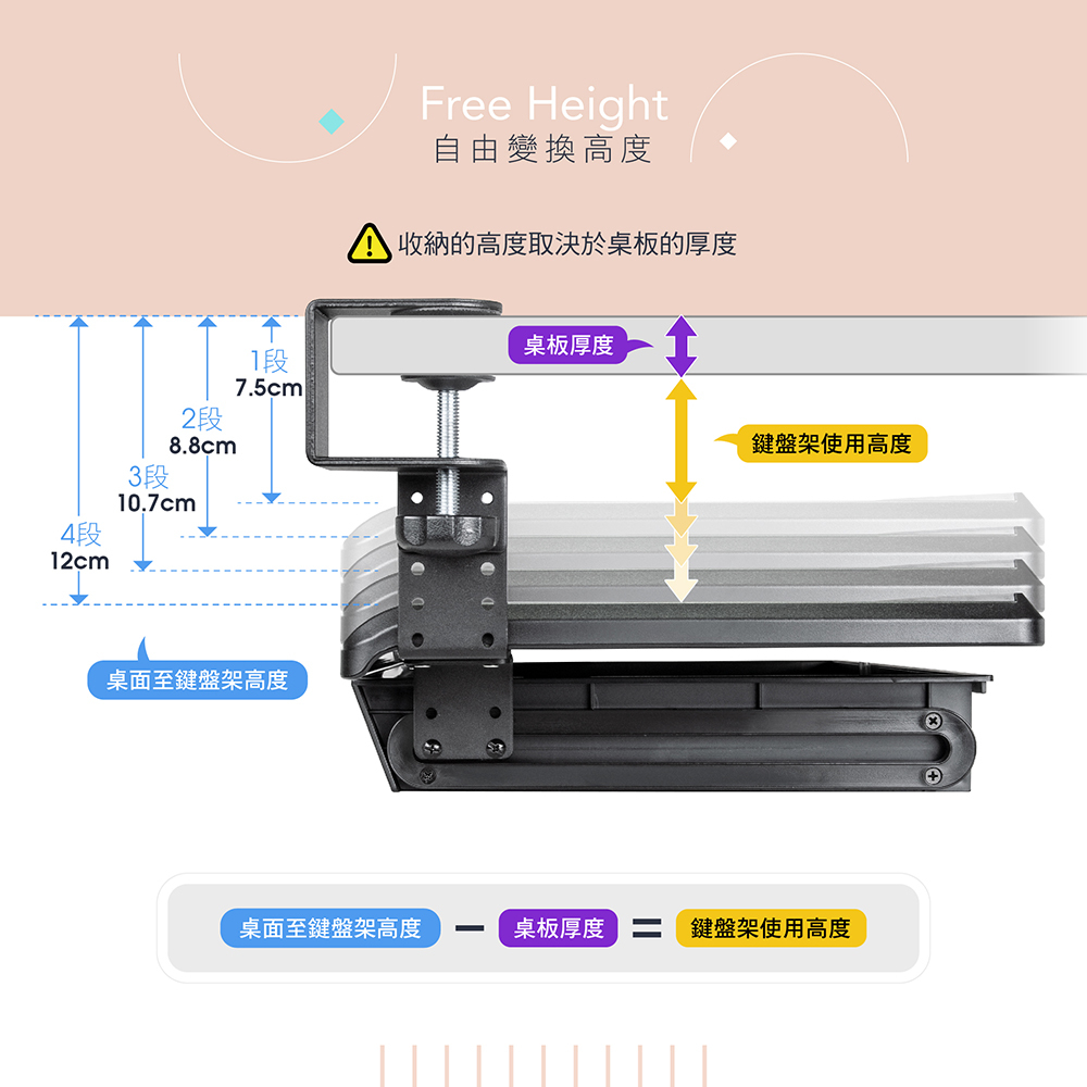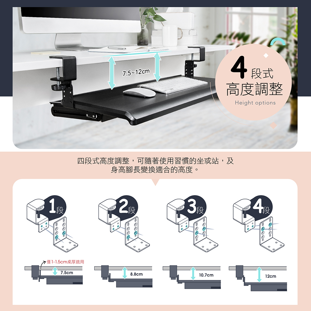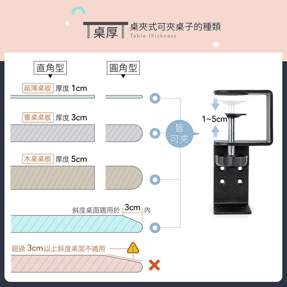 1. 請實際測量桌板厚度,確認厚度在夾距範圍內(1~5cm)再行購買