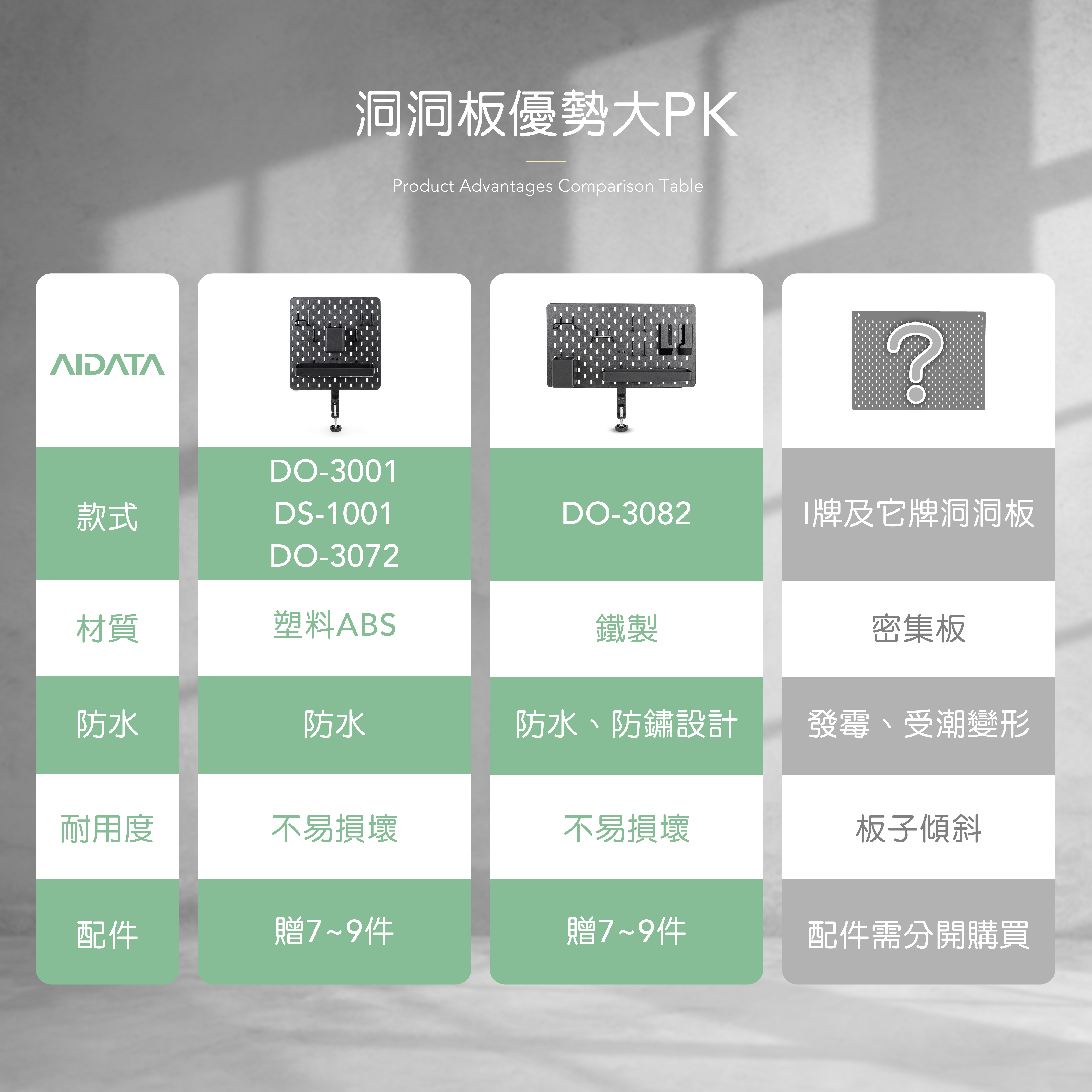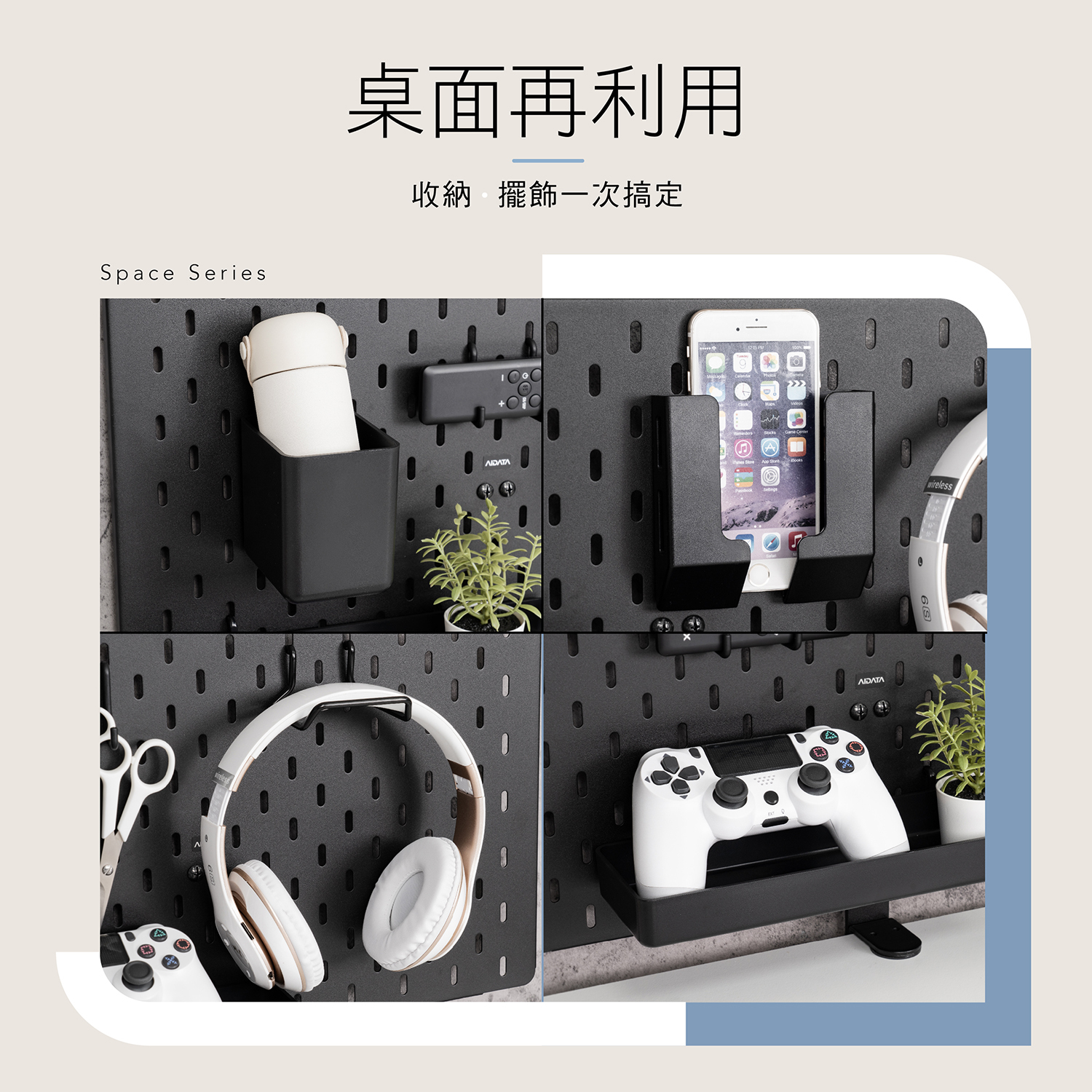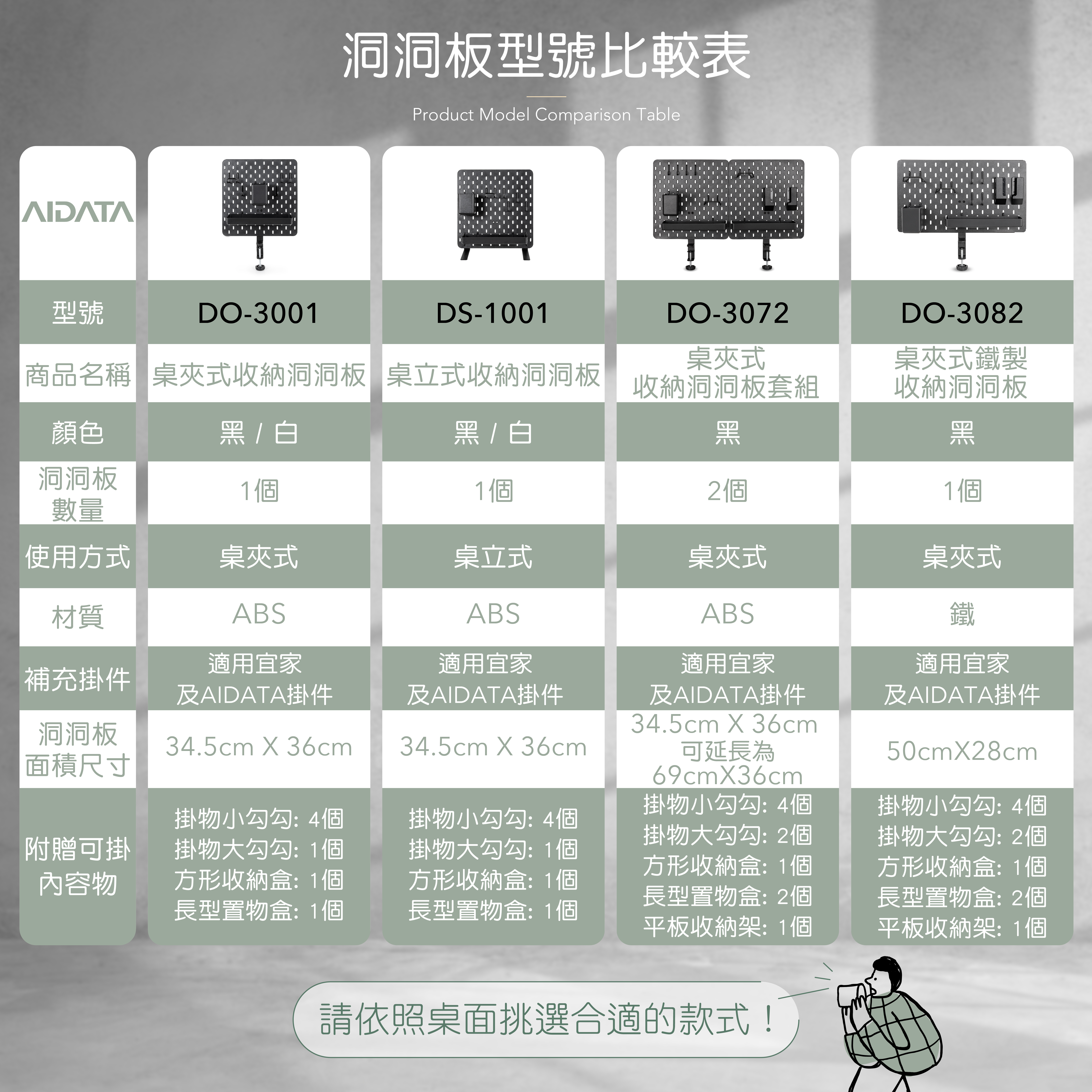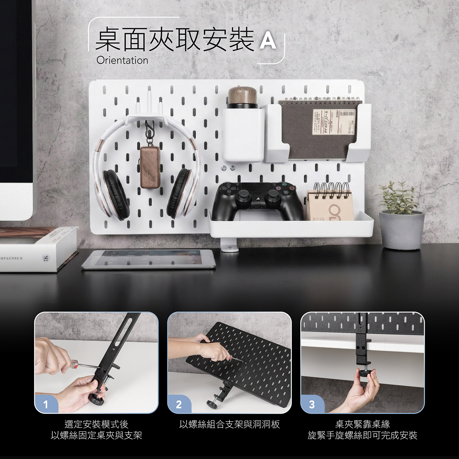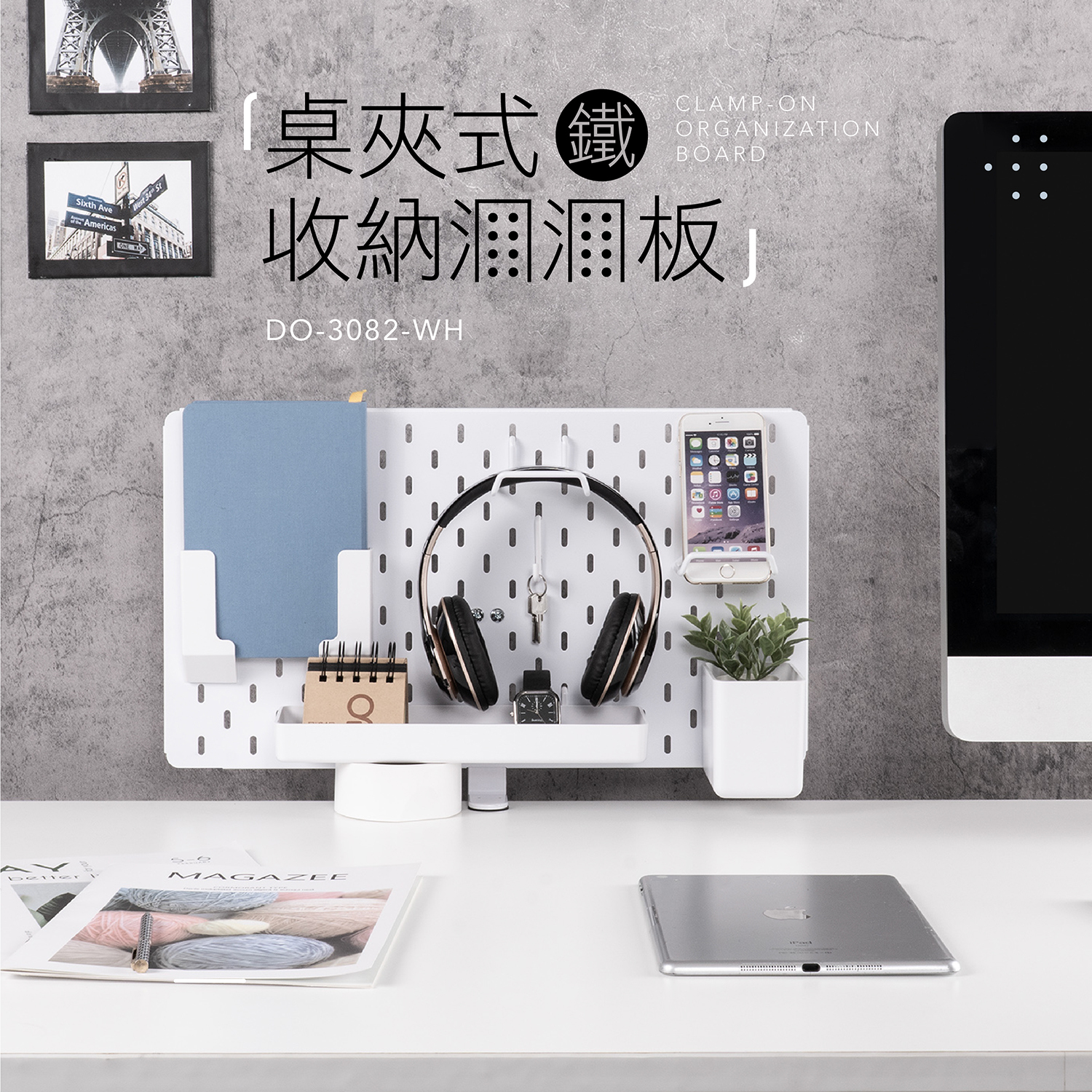 鐵製洞洞板、桌夾、掛鉤包、螺絲包、長型置物盒、方型收納盒、平板收納夾