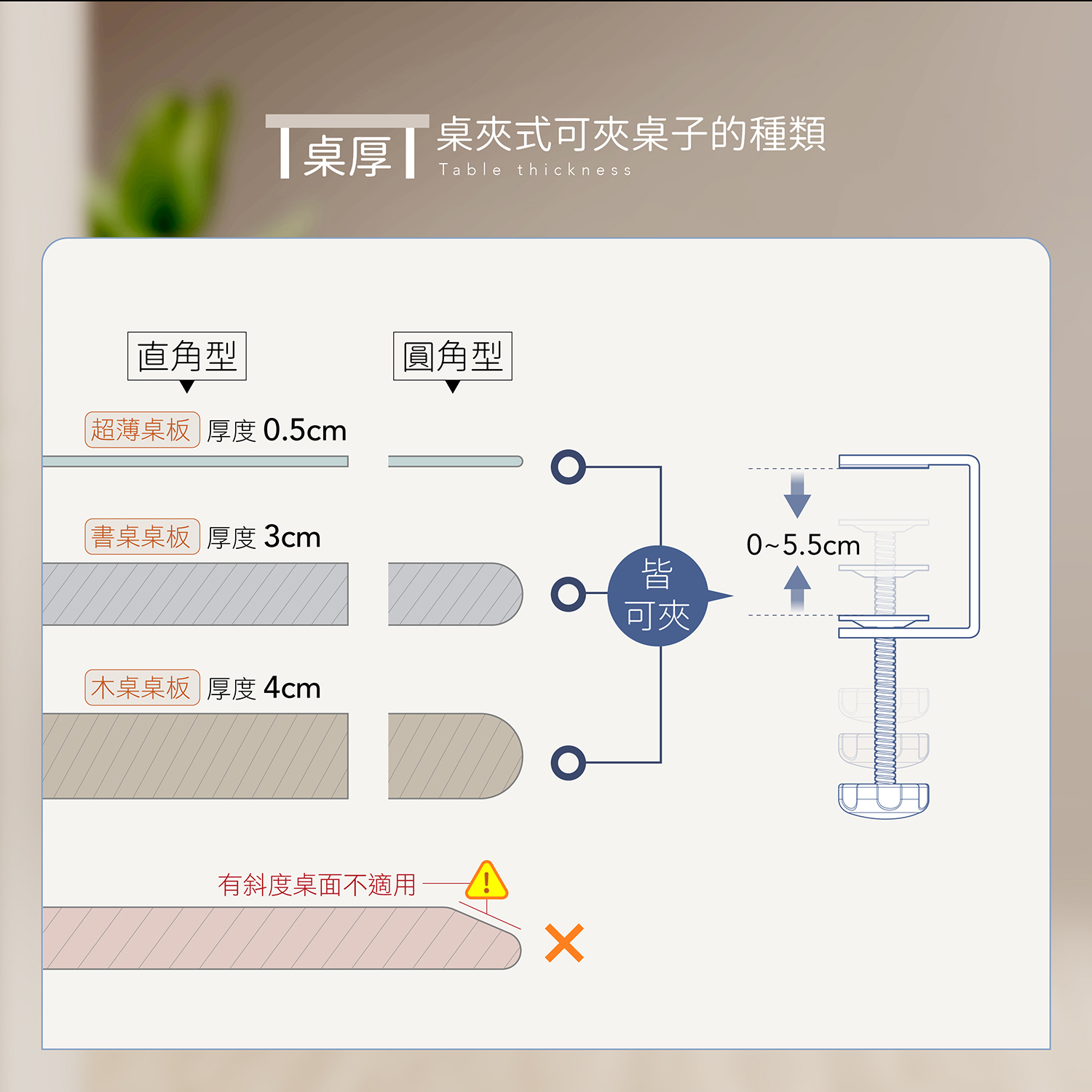 1.           請實際測量桌板厚度,確認厚度在夾距範圍(5.5cm)內再行購買